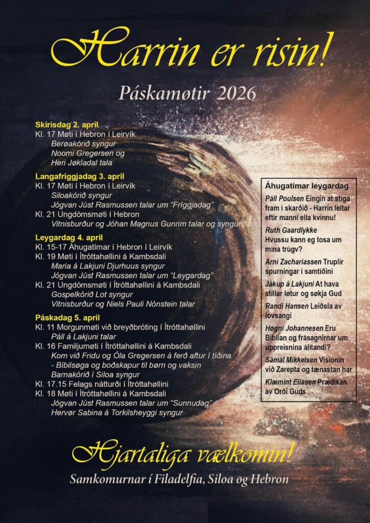 Í ár eru tað samkomurnar í Filadelfia í Gøtu, Siloa í Fuglafirði og Hebron í Leirvík sum bjóða til samfelagsmøtir á páskum. Sí skránna niðanfyri.